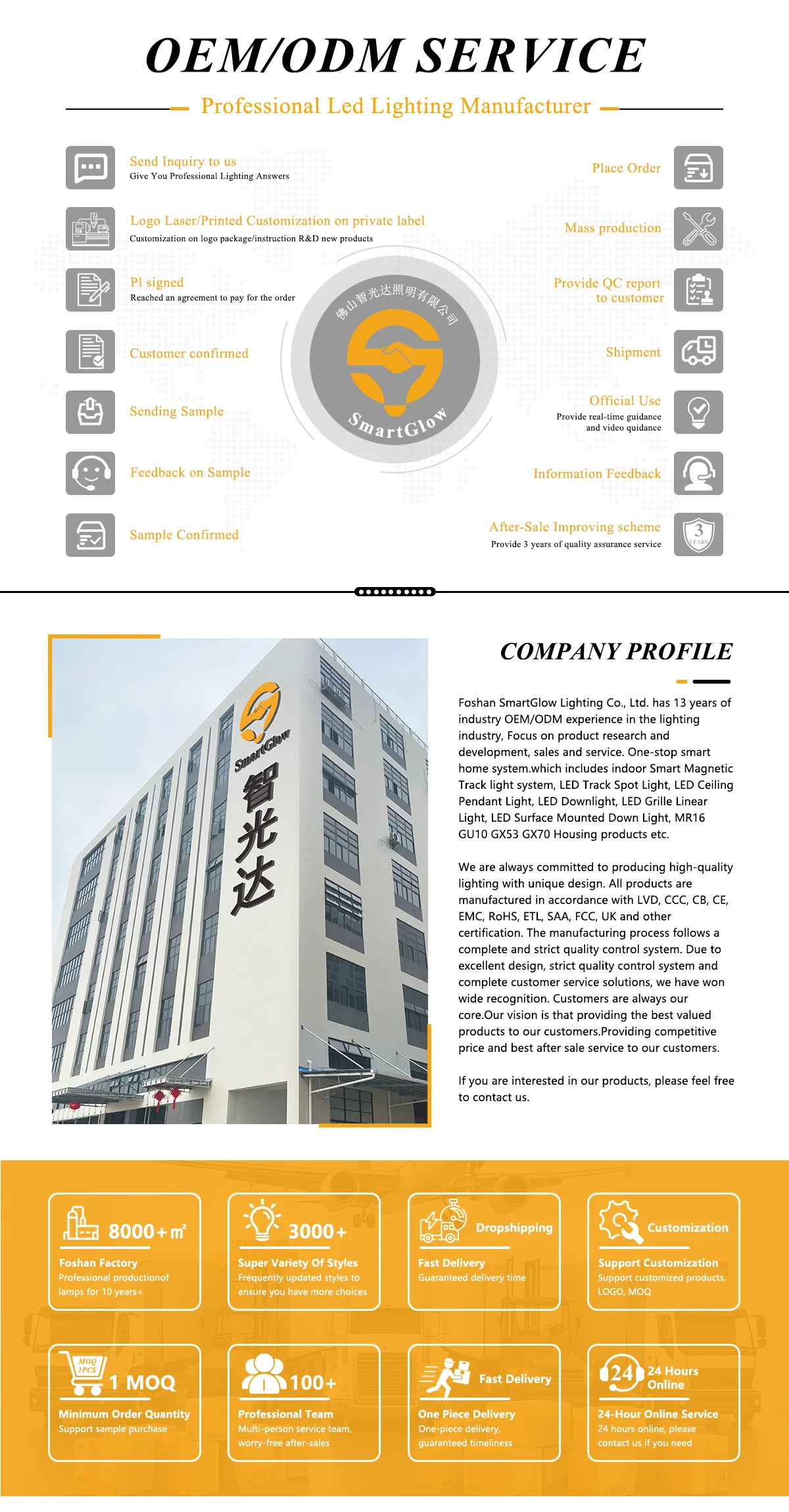 Foshan SmartGlow Lighting Co., Ltd. has 10 years of industry OEM/ODM experience in the lighting industry, Focus on product research and development, sales and service. One-stop smart home system.which includes indoor Smart Magnetic Track light system, LED Track Spot Light, LED Ceiling Pendant Light, LED Downlight, LED Grille Linear Light, LED Surface Mounted Down Light, M R 16 G U 10 G X 53 G X 70 Housing products etc.